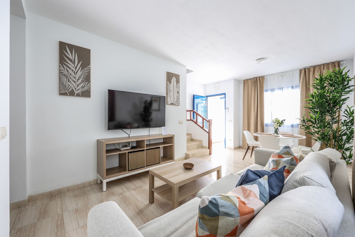 Casa esquinera muy acogedora y moderna con un gran jardín privado en la parte trasera y una piscina comunitaria muy bonita y grande, Wifi, plaza de aparcamiento privado, ideal para unas vacaciones agradables y relajantes, A 2 minutos a pie del paseo marítimo (cerca del mar), a 10 minutos de Marina Rubicón y 5 minutos de la tienda, jardín privado con palmeras y terraza ideal para relajarse y tomar el sol El complejo residencial Iris es hermoso y tranquilo