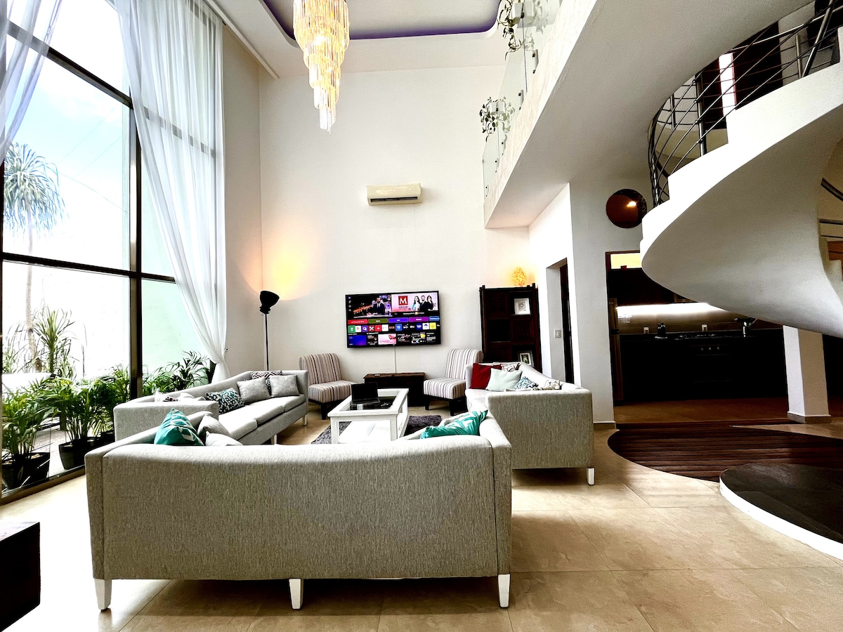 Increíble Penthouse con acabados de lujo, cómodas habitaciones y espacios muy amplios, cuenta con jacuzzi para 20 personas ( en caso de requerir que se caliente a una temperatura máxima de 36 grados el costo por día es de 2000 pesos 8 horas y puede calentarse antes de la 1 pm) A una calle de la Quinta Avenida. NO SE PERMITEN FIESTAS. Ofrecemos el servicio de limpieza por día con un costo de 1000 pesos, el huésped puede solicitar los días y la hora que la requiera mandando un mensaje vía Airbnb