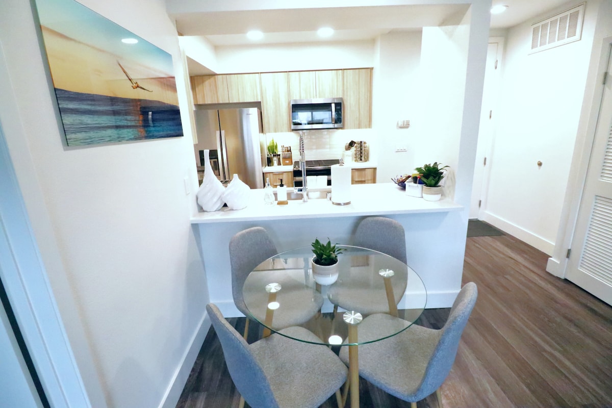 Los acabados elegantes y de alta gama completan este alojamiento completamente remodelado que ejemplifica el lujo cómodo. Este 1 dormitorio es espacioso y perfecto para una pareja o un viajero de negocios. ○ Televisor inteligente Roku de 50pulgadas con cable básico y aplicaciones ○ Cocina completa con lavavajillas, agua filtrada, máquina de hielo, Keurig, utensilios de cocina, utensilios de cocina, utensilios, etc. ○ Estacionamiento reservado en garaje (compacto), baño de azulejos con bañera/ducha, jabones ecológicos, calefacción central y aire acondicionado, mucha luz natural, caminable a los restaurantes, cierre electrónico fácil