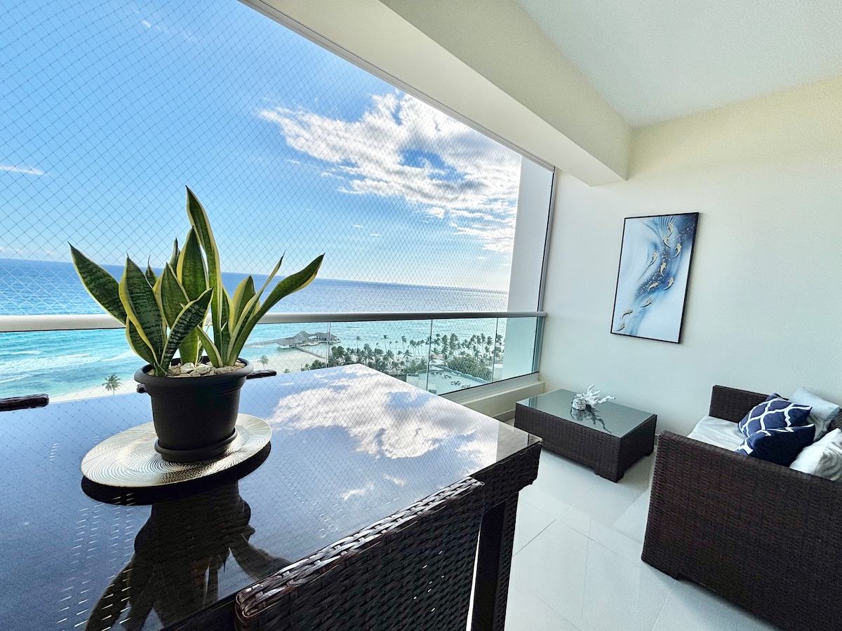 A 20 minutos del Aeropuerto se encuentra este apartamento en el piso 19 con la mejor vista a la playa Juan Dolio. De 1BD, 2 baños, cocina full equipada, aire central, 2 TVs Smart 65 y 55 pulgadas con Netflix, Disney plus, teléfono, telecable, wifi 24 horas, desayunador, sofá cama, malla de protección y Shutter. En los espacios comunes cuenta con gimnasio, piscinas, Jacuzzi con calentador, BBQ, amplios parqueos, playground para niños y adultos con mesa de billar, mesa de domino, futbol de mesa...