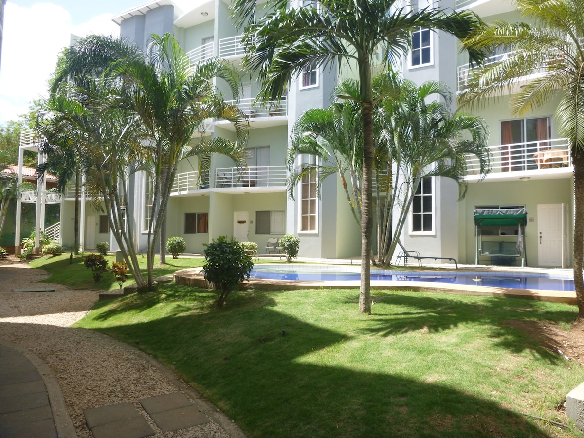 Apartamento equipado con todo lo que necesitas para corto o largo plazo de estadía. Internet rápido, ubicado en una rotonda residencial tranquila donde casi no circulan autos. A 300 metros de la playa, restaurantes, banco, supermercado, 100 metros del gym super céntrico. Puedes salir en la noche y volver caminando. Es normal ver en el patio, iguanas, monos aulladores, zorritos, Aves, ardillas etc. Los huespedes tiene descuentos en el surf shop Club 33 y además te ayudare a recomendarte otras act