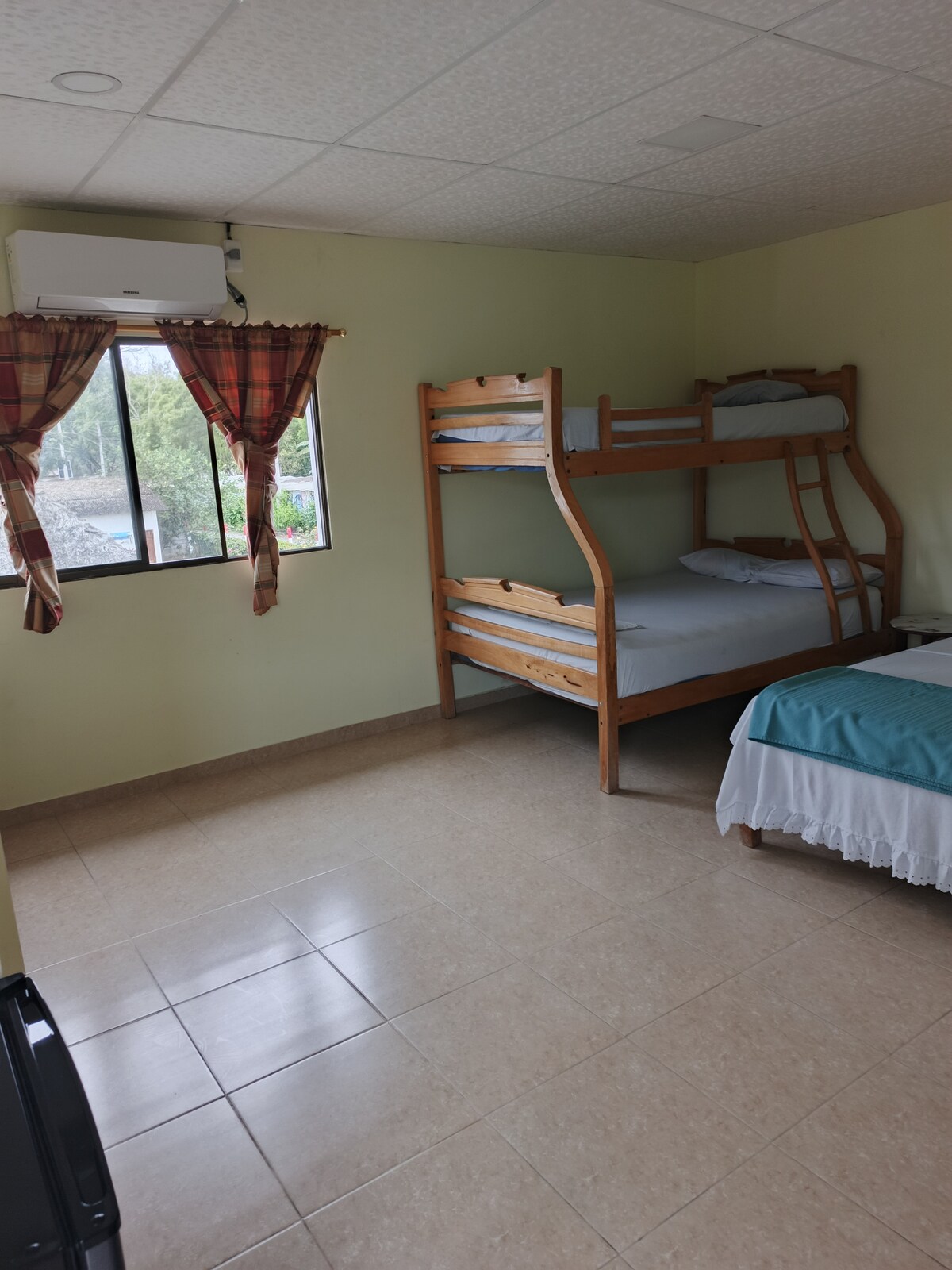 Habitación en planta baja con una cama matrimonial y dos literas de 1.5 plazas, ideal para grupos o familias de hasta 6 personas. Tiene aire acondicionado, baño privado funcional, Smart TV con Netflix, estante tipo armario y colgador de ropa. Cómoda y bien ventilada. Acceso libre a piscina, cocina, parrilla, jardines, hamacas y más. A solo 7 minutos de la playa y del centro de Montañita, pero alejado del ruido. Tranquilidad y espacio para compartir.