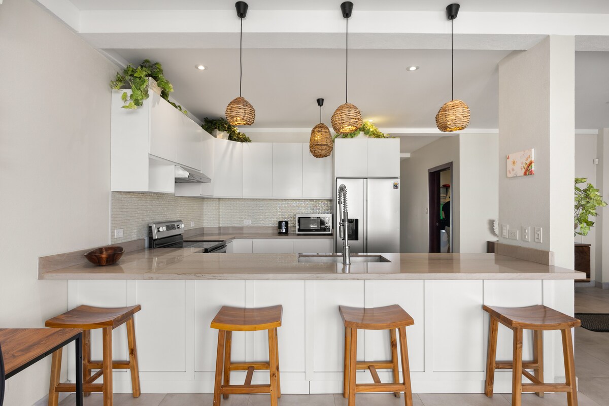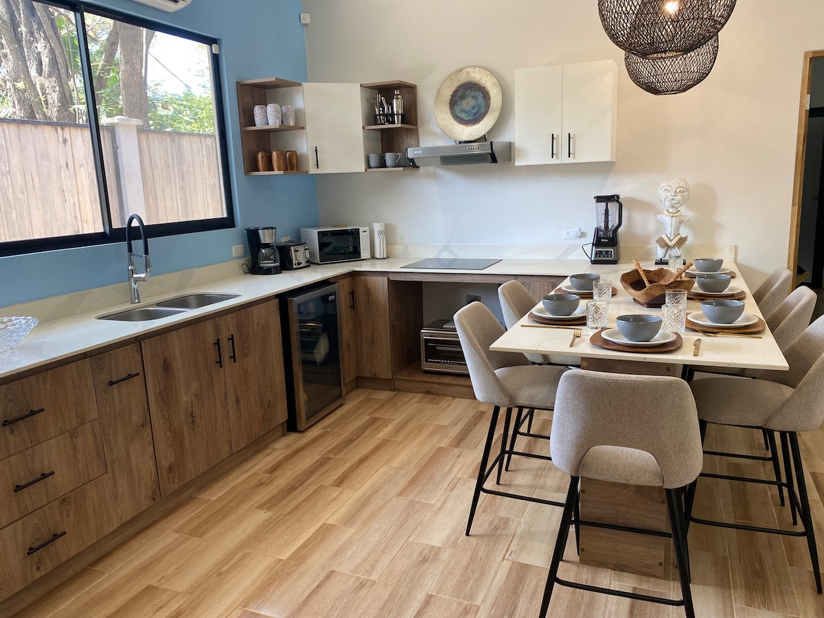Este alojamiento luminoso y espacioso tiene líneas modernas y limpias, tonos neutros y texturas naturales que reflejan la belleza de la costa de Costa Rica. La cocina abierta cuenta con mesadas de cuarzo, elegantes gabinetes blancos y electrodomésticos de acero inoxidable, todo enmarcado por iluminación artesanal y detalles de vegetación exuberante. El living se conecta a la perfección con tu terraza privada, ideal para tomar el café de la mañana, disfrutar de un trago al atardecer o hacer un asado frente a la playa.<br><br>