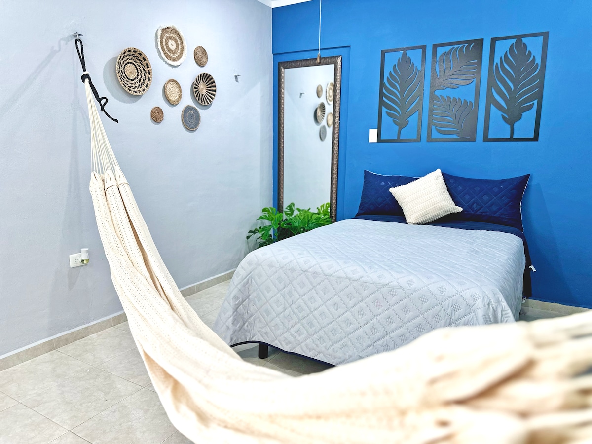 Imagina una escapada para dos en una acogedora casa de un solo piso, a solo dos cuadras de la playa. El patio cuenta con hamacas, ideales para relajarte bajo el sol, una alberca privada para refrescarte cuando desees y disfrutar de la noche estrellada alrededor de una fogata. En este refugio, cada rincón está pensado para brindar comodidad y una experiencia tranquila. ¡Tu escapada te espera!