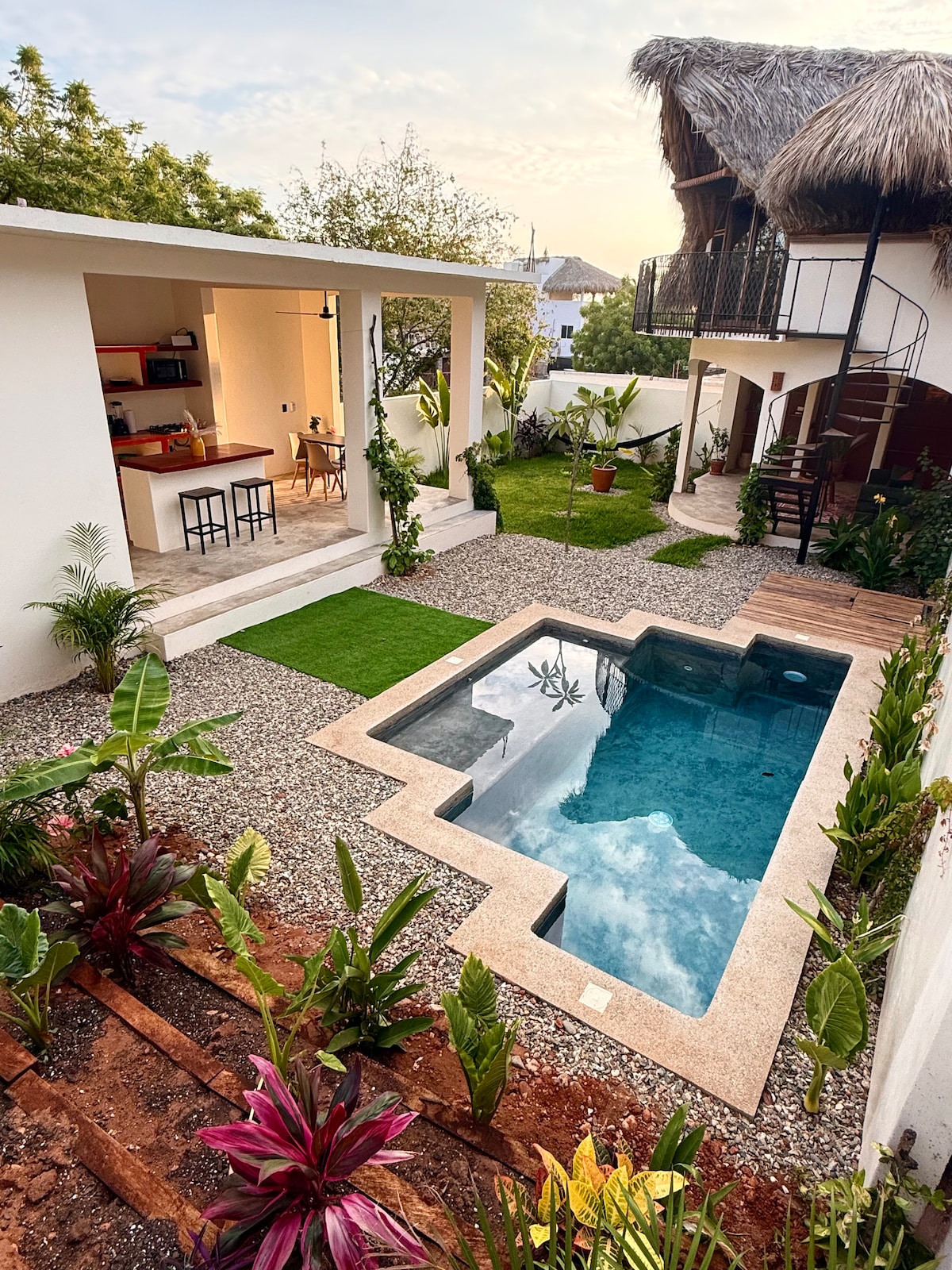 Recientemente apareció en Condé Nast Traveler «35 Airbnbs con piscinas increíbles» @casahezbo es una de las cuatro casas con este diseño único, servicios de primera calidad, internet Starlink de alta velocidad, lo mejor de Puerto Escondido a la vuelta de la esquina. Situado en La Punta, a 5 minutos a pie de la playa, restaurantes, bares y cafeterías. Dos dormitorios (king y queen), dos baños completos, una cocina completa, sala de estar, comedor y piscina en un diseño interior-exterior único. Los dormitorios incluyen persianas, son totalmente cerrados, incluyen aire acondicionado y ventiladores de techo.