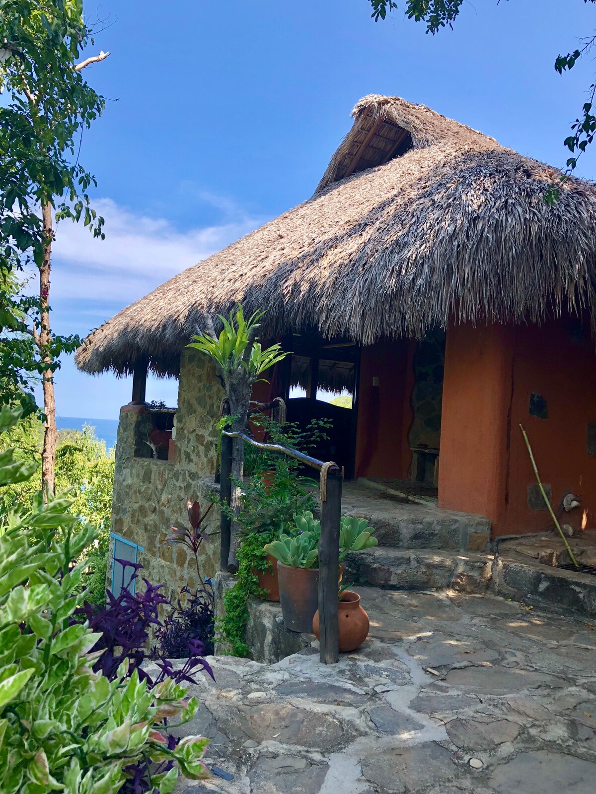 Con una vista espectacular al mar y envuelto por la rica vegetación del cerro de Mermejita, Casita Erizo es una de los dos casitas independientes de nuestra casa, La Extraviada. Se encuentra a solo cinco minutos caminando de la tranquila y majestuosa playa Mermejita y a quince minutos caminando del centro de Mazunte, con su ambiente relajado y sus ricos restaurantes.