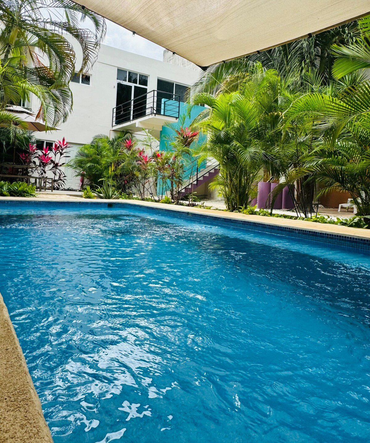 Come and enjoy a quiet and a nice place, with pool, terrace, lounge chairs and hammock. In the kitchen utensils to cook. In the bathroom we put towels, shampoo, body wash 🧴 It is close to Chedraui, you can walk there 5-8 minutes. Is one block from the Main Street Juarez Avenue, were you can take a taxi or a van. In Juarez avenue are few small restaurants, laundry, groceries store Oxxo. It is 3 blocks from hiway where you can take the vans to Tulum or Cancún. 20 minutos walking to the beach.