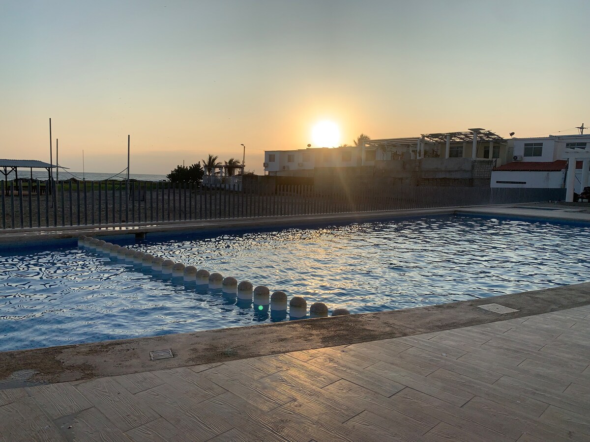 Disfruta de un espacio casero frente al mar. Un lugar elegante, amplio, capaz de acoger comodamente hasta ocho personas en un 10mo piso a la orilla del mar, excelente para pasar unos hermosos días en familia, relajarse con amigos, compartir en pareja o simplemente alejarse del ruido de la ciudad y retirarse a mirar las estrellas 🌟 Siempre resguardando su bienestar con seguridad 24/7 en garita como en la playa; ademas de proteger su privacidad con ascensor funcional con tarjeta de acceso al piso.