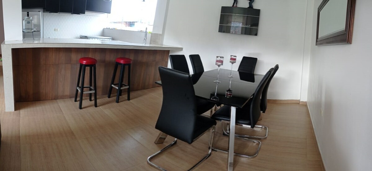 Exclusivo, Amplio y Moderno departamento. Cajamarca, Maravilla del Perú - Capital del Carnaval Peruano, estámos ubicados cerca de los principales centros comerciales, 1.8 km del aeropuerto, 2km Plaza de Armas, zona segura para descansar, discreta y privada. Equipamiento en todos sus ambientes: Hall, sala comedor, cocina, lavanderia, 2 baños, 3 cuartos y una oficina de trabajo.