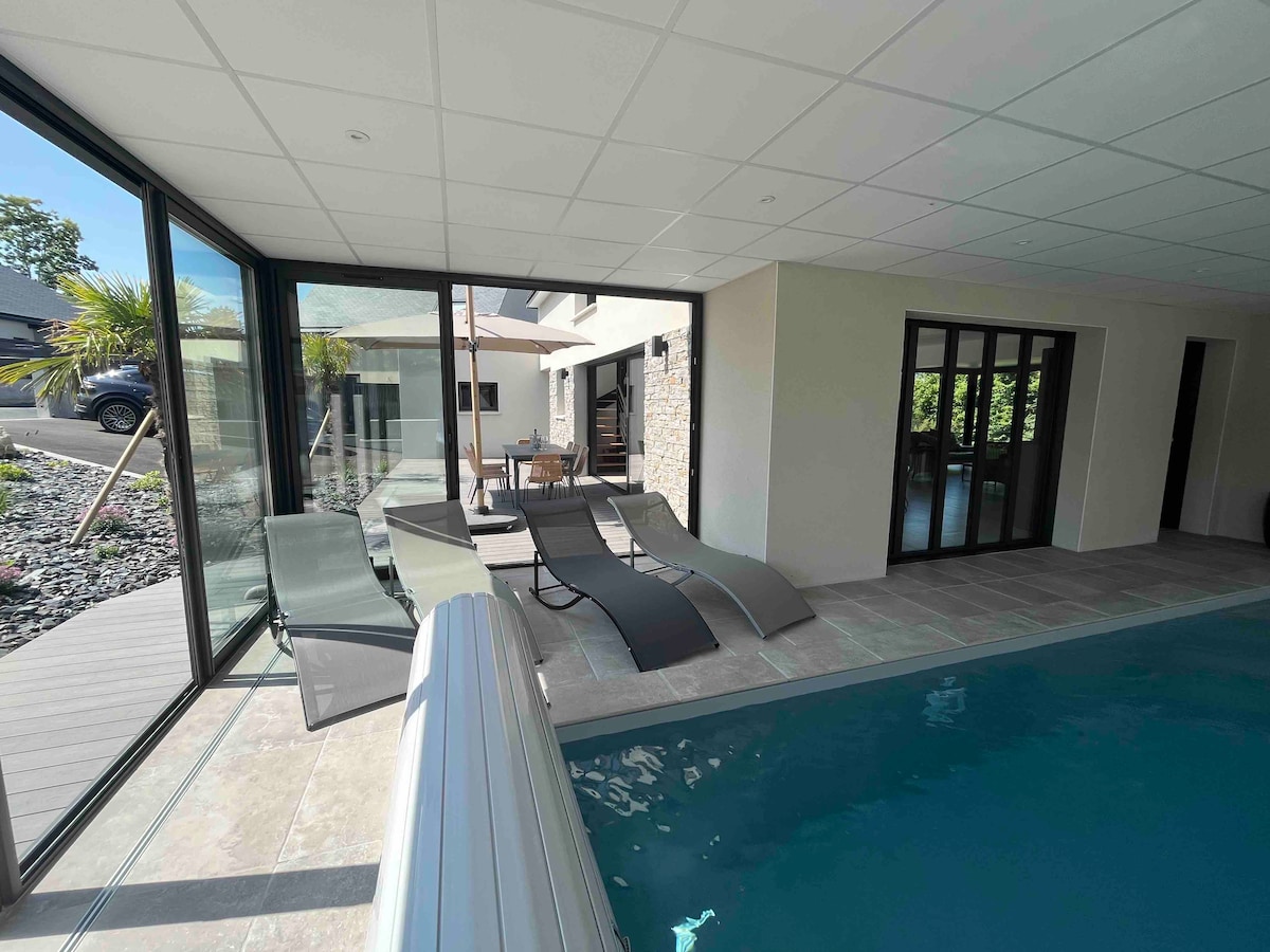 Casa de arquitecto de lujo con todas las comodidades Ubicación ideal entre el puerto, el centro de la ciudad y la playa de Perros Guirec. La casa consta de 4 dormitorios con baños y aseos en cada uno, así como un baño PMR. Cocina totalmente equipada, sala de estar con pantalla grande y canales vía satélite. Una preciosa piscina cubierta climatizada y varias terrazas exteriores. Gran jardín, barbacoa, mesa de «ping pong» Aparcamiento privado con estación de carga eléctrica.