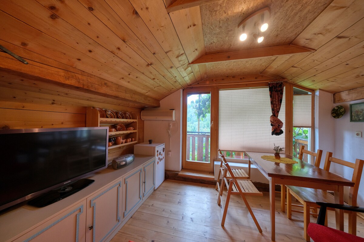 Small cabin, renovated in an old and traditional style, where homeliness, originality and comfort are intertwined. Chalet is located in a quiet location, away from the hustle and bustle. It has two terraces. The simplicity of the cabin takes us into the role of shepherds, where we can enjoy the warm evening atmosphere of the crackling of the fire. It has a large luxury bathroom with underfloor heating and a shower with hot water. Chalet has fully equipped kitchen, a dining area and a sofa.