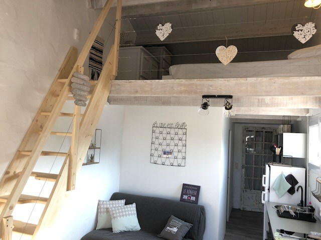 Petite maison (32m2), lumineuse avec terrasse et jardin privatif. Petite cuisine aménagée, salle de douche-wc et chambre avec lit double séparée de la pièce de vie. Il n'y a pas la possibilité d'ajouter un lit bébé ( lit parapluie ou autre) dans la chambre. La maison n'est pas accessible aux personnes se déplaçant en fauteuil roulant. La maison, située au fond de notre jardin, est à la sortie du port et à 5min à pieds de tous les commerces.