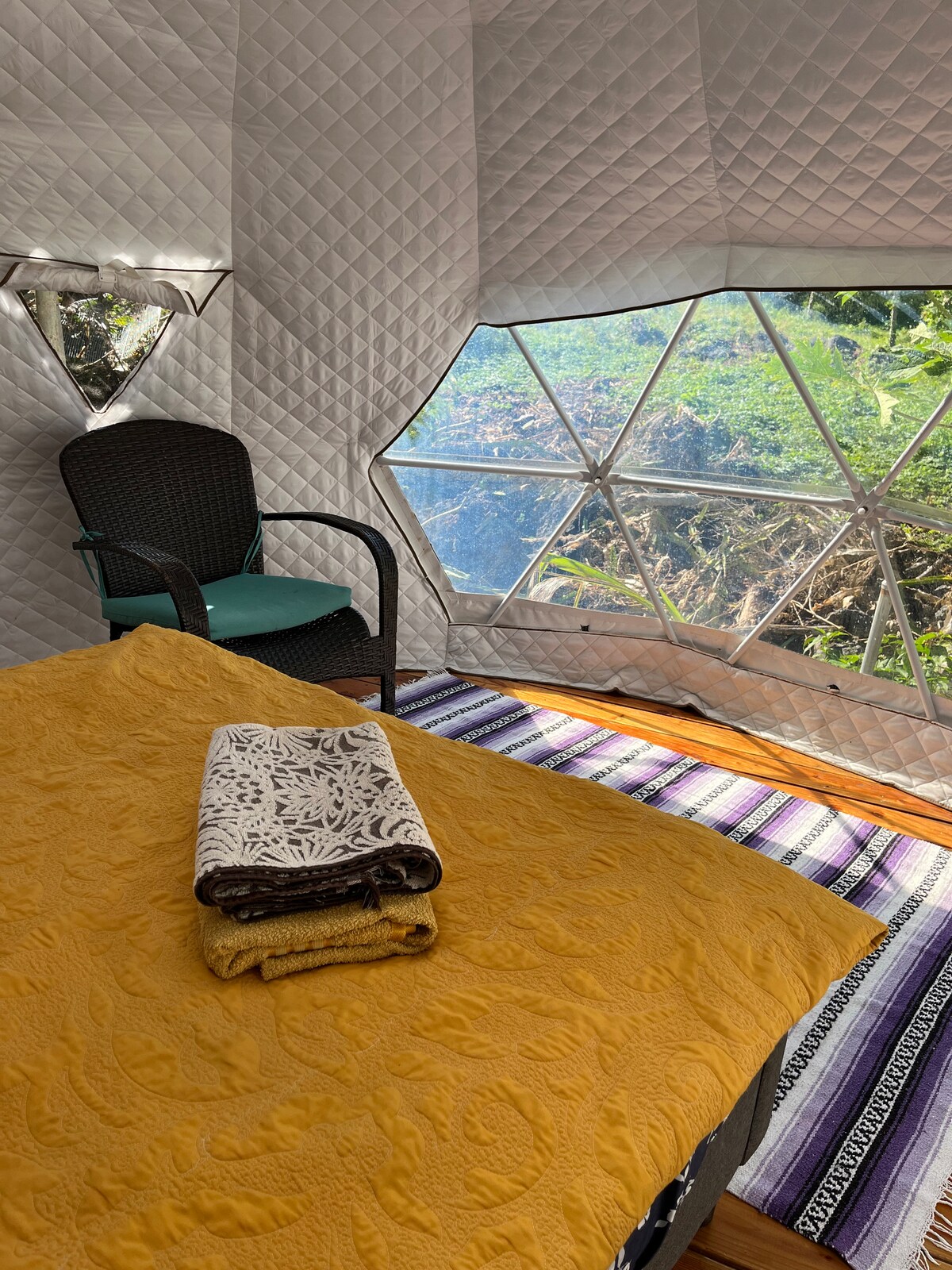 Escápate al paraíso en nuestra exclusiva experiencia de cúpula geodésica glamping ubicada en una exuberante propiedad de 3 acres. Te encontrarás rodeado de los vibrantes colores y fragancias de las frutas tropicales, como café, piñas, plátanos y una variedad de otras frutas tropicales. Disfruta de vistas panorámicas al mar que se extienden hacia fascinantes puestas de sol, creando un ambiente de pura tranquilidad. Nuestra cúpula ofrece una mezcla única de vida fuera de la red y comodidad moderna, alimentada por fuentes de energía sostenibles.