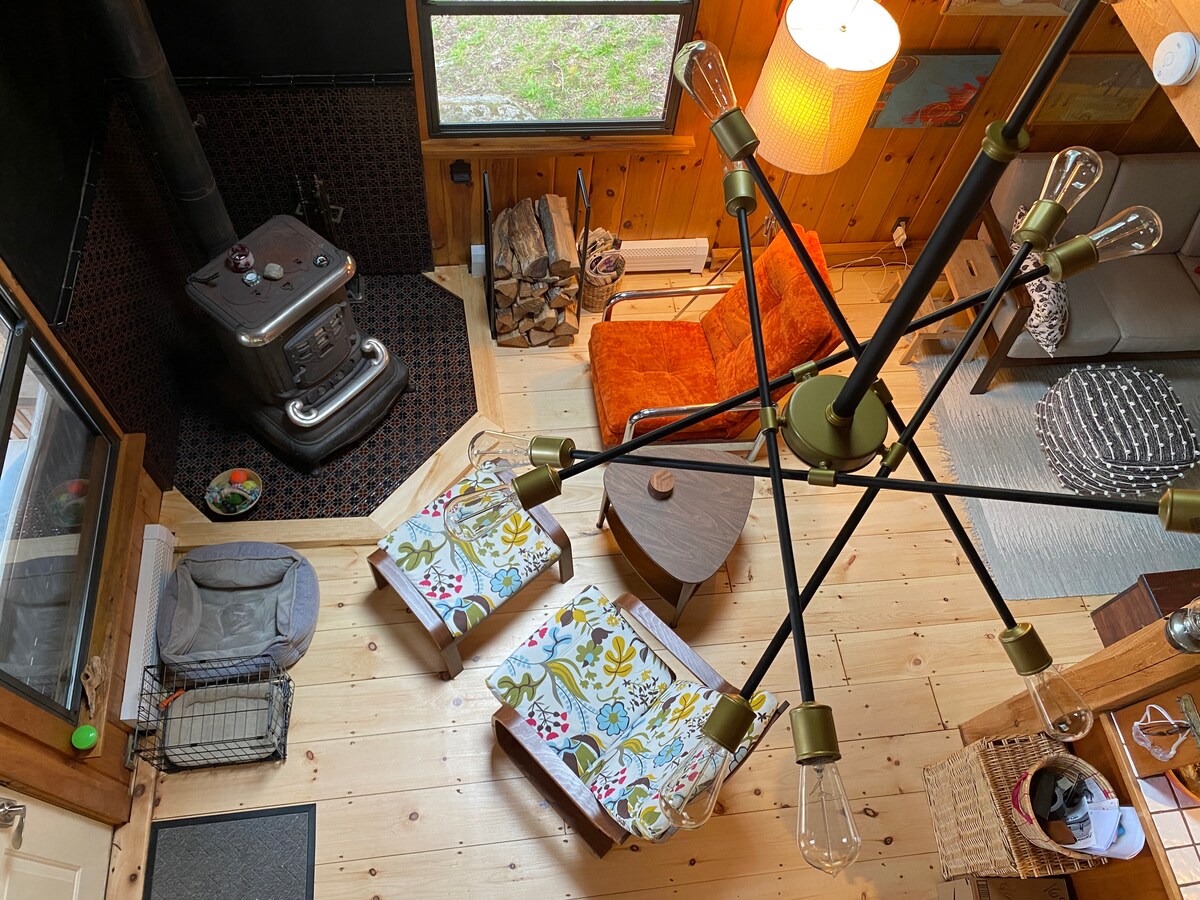 • Perfect for small families or couples, our signature A-Frame cabin features a modern interior gas burning fireplace, soaring ceilings, huge windows, stylish interiors, and all the comforts of home. • This cozy 1,100 square foot space comfortably accommodates up to four guests in two bedrooms (one with a King-size bed and the other with a Queen-size bed) and a shared bathroom. • 7 minute drive to downtown Freeport. • Proud to be ranked in the top 1% and voted Guest Favorite!