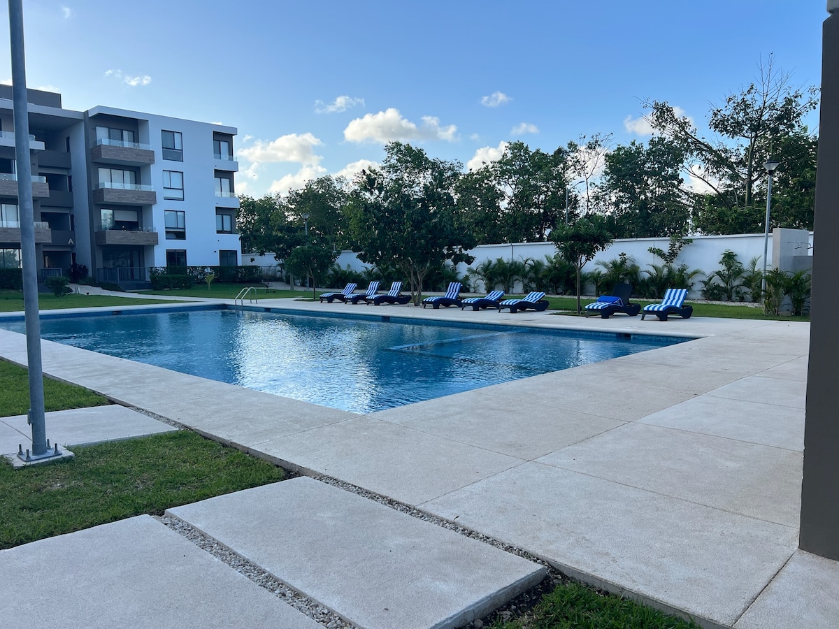 Relájate con toda la familia en este alojamiento donde la tranquilidad se respira. Departamento totalmente nuevo y equipado. Cuenta con 2 recámaras con clósets, climatizado, wifi, Smart tv en sala. Fraccionamiento seguro y tranquilo, con área de juegos, parque para mascotas, área de asadores, cancha multideportiva y alberca con palapa, cuenta con gimnasio al aire libre. Ubicado a 5 min de Plazas comerciales, 5 min del Tren Maya, 20 min de la 5ta avenida, 25 min de parques Xcaret y de Tulum.