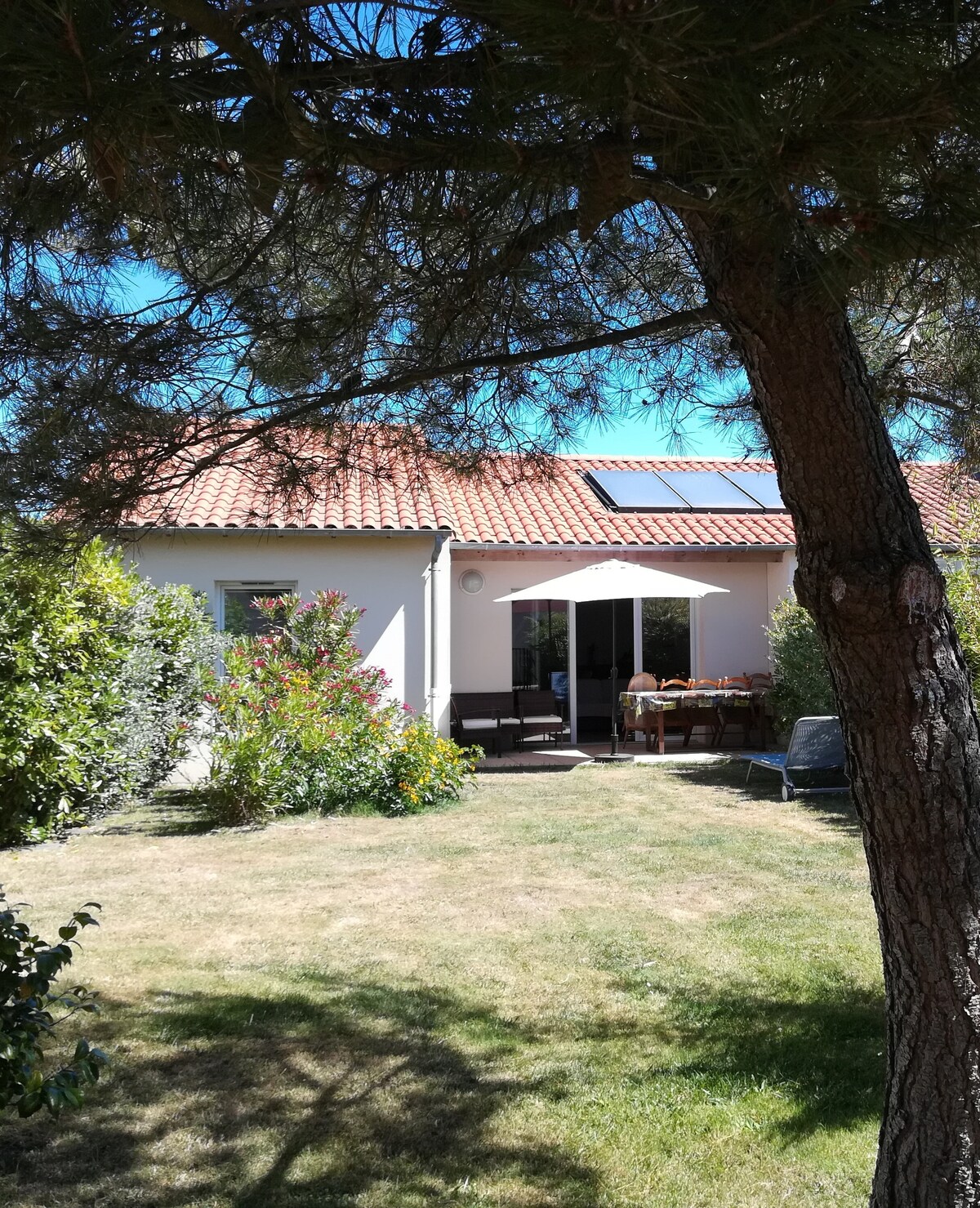Espacio muy cálido, limpio y cómodo con terraza orientada al suroeste equipada con una mesa y cuatro sillas con vistas al campo de golf de Pornic. Ideal para dos personas que deseen tranquilidad estando cerca de la playa (12 minutos/a pie), el centro de la ciudad (18 minutos/a pie), las tiendas (10 minutos/a pie). Están disponibles: la piscina y dos bicicletas. Flexibilidad de fechas, no dude en llamarme. La tarifa se puede ajustar en función del número de días de alquiler.
