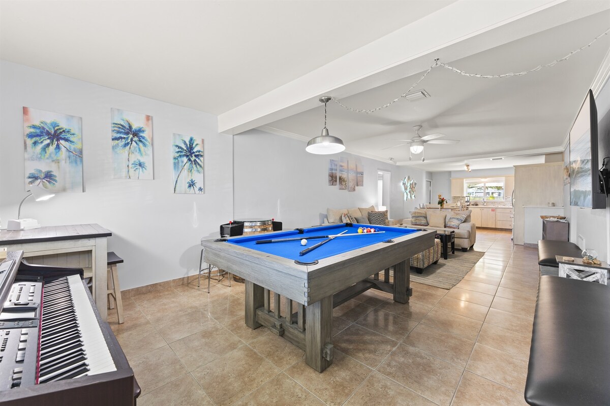 Tu familia estará cerca de todo cuando te hospedes en esta casa céntrica con piscina. A solo 1,9 millas del distrito de arte de Eau Gallie, restaurantes elegantes, tiendas y diversión. También estarás a menos de 5 millas de las playas aptas para mascotas y a menos de 10 minutos del centro de Melbourne. En el sitio disfrutarás de una hermosa piscina de agua salada, bar en el patio, mesa de billar, televisores de alta definición e internet Gigabyte con mucho espacio. 2 camas queen, 2 individuales, sofá, hamaca y colchón de aire tamaño queen y un corralito