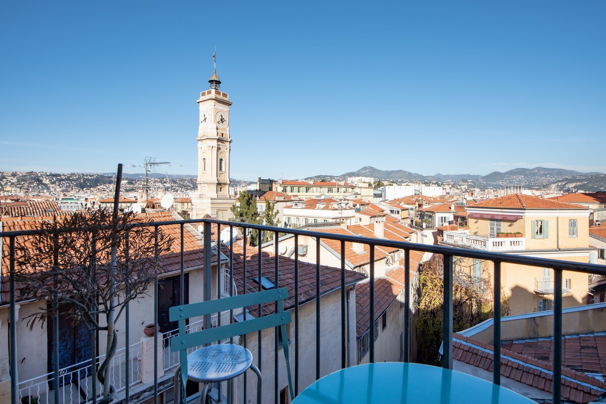appartement confortable et chaleureux pouvant accueillir deux personnes (une chambre à coucher dotée d'un lit Queen size ) pour 6 nuitées minimum avec vue inoubliable de son toit terrasse sur le port de Nice, au pied de la colline du château avec son parc, mitoyen du quartier des antiquaires et du nouveau quartier "branché" de la Place du Pin, à proximité directe de la vieille ville , de son marché aux fleurs, de la promenade des Anglais longeant les plages de la baie des Anges,
