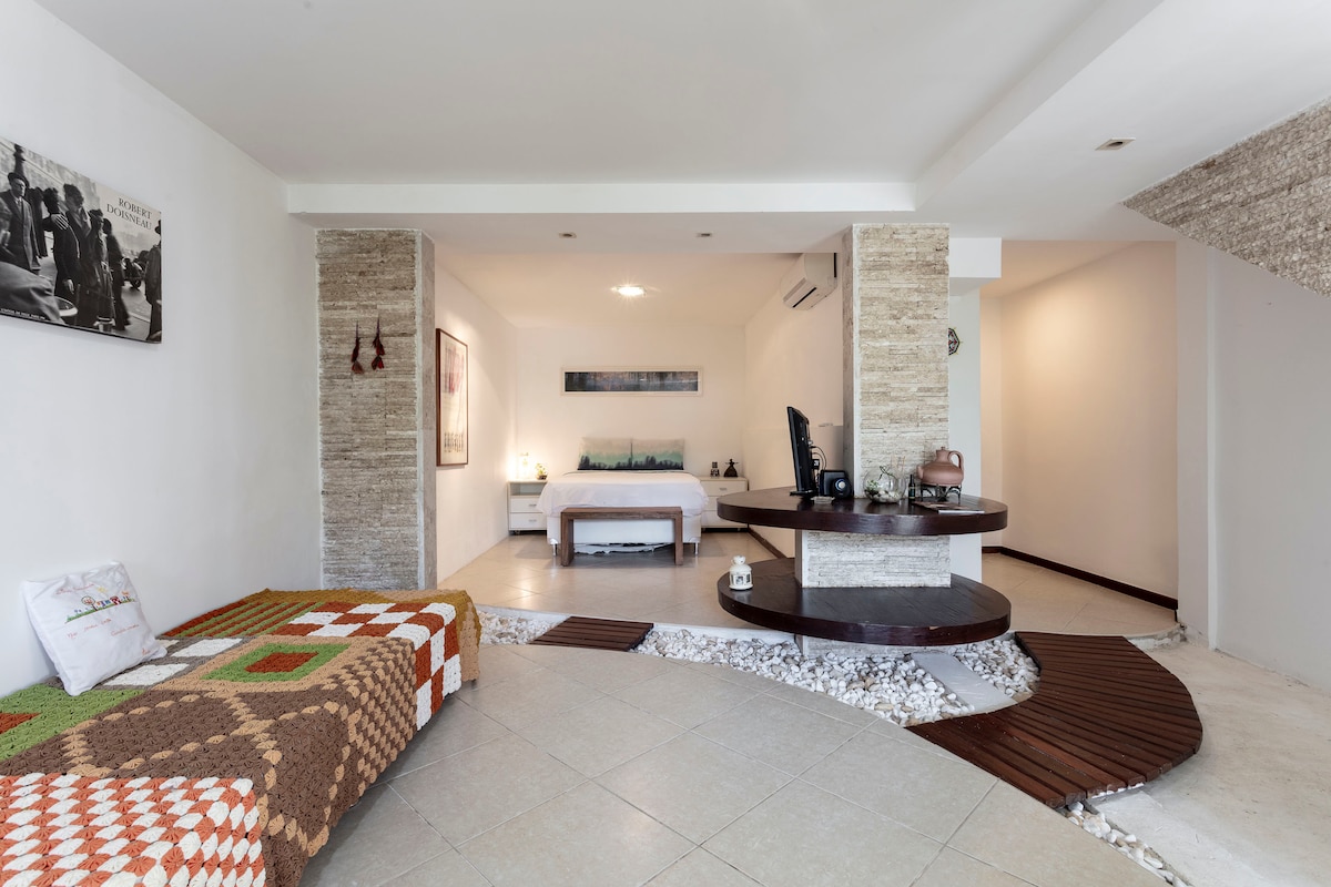 Estudio de 50 m² con cama tamaño queen, aire acondicionado, TV, wifi, armario, sofá, mesa de comedor, baño y balcón. Ubicado en un condominio bucólico, muy tranquilo, con aires interiores, pero cerca de todo.