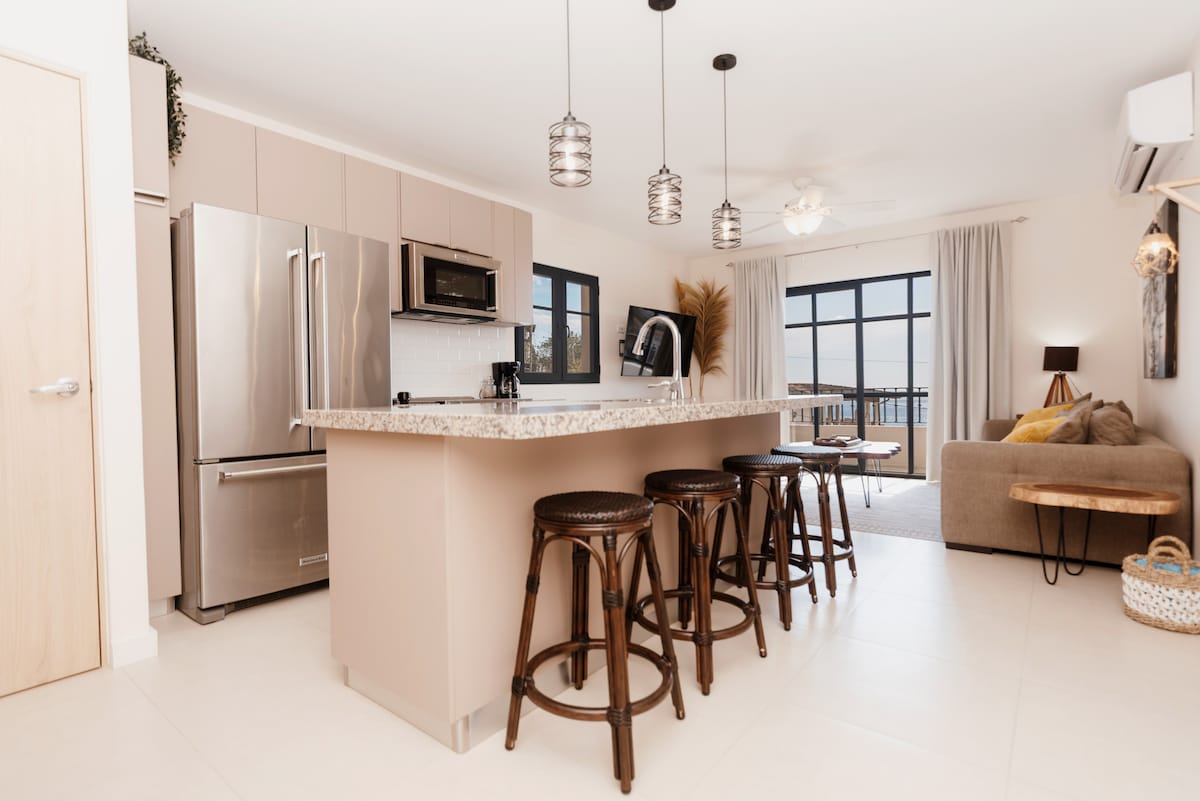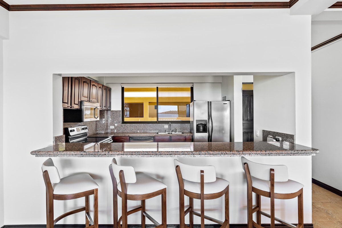 ¡Disfruta de la vida frente a la playa, las majestuosas vistas y las puestas de sol desde tu propia terraza privada, patio o piscina! Este hermoso departamento de 1 dormitorio y 1 baño tiene una cama tamaño king, baño privado y la cocina tiene una gran isla y está totalmente equipada con todos los utensilios de cocina que necesita para disfrutar de cenar en casa. Tendrás una amplia sala de estar y una terraza cubierta para disfrutar de las fabulosas vistas al mar de las islas Catalina, el puerto deportivo de Flamingo y la bahía de Potrero. A solo una hora del aeropuerto de Liberia.