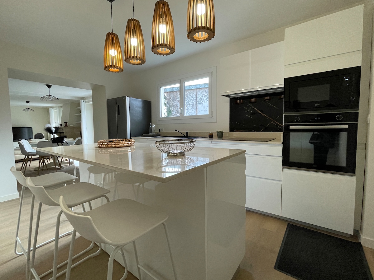 Muy bonito apartamento en el segundo piso de una casa burguesa del siglo XIX, en el corazón de un parque centenario, recomendado por Le Petit Futé. Un enclave encantado en el centro de la ciudad, a menos de 5 minutos a pie de la estación de tren y del centro turístico. Las 2 habitaciones, muy amplias, tienen cada una una cama de 160x200 y un escritorio. Un amplio sofá ofrece la quinta cama. Una cocina totalmente equipada, abierta al salón, le ofrece un espacio ideal para disfrutar del copioso desayuno.
