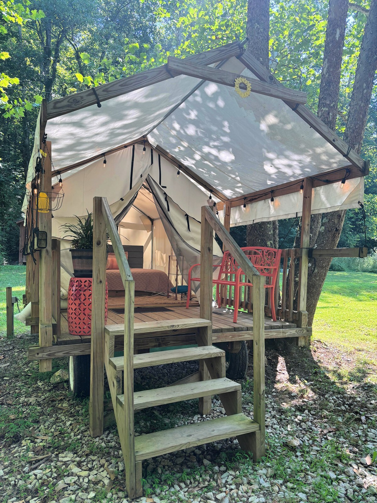 ¡El ROJO! Lujo rústico para dos personas escondidas de las otras tiendas de campaña. Amplio pero encantador, The Red tiene mucho que ofrecer. Un acogedor porche delantero, una chimenea privada, parrilla de carbón estilo parque, nevera, microondas y cafetera también. Mantente caliente y acogedor con la chimenea de imitación y la manta eléctrica. El baño #2 asignado proporciona privacidad, una ducha caliente y toallas limpias. ¡Jabón y champú también! La casa de baños está a pocos pasos de la carpa y cada carpa tiene su propio baño privado.