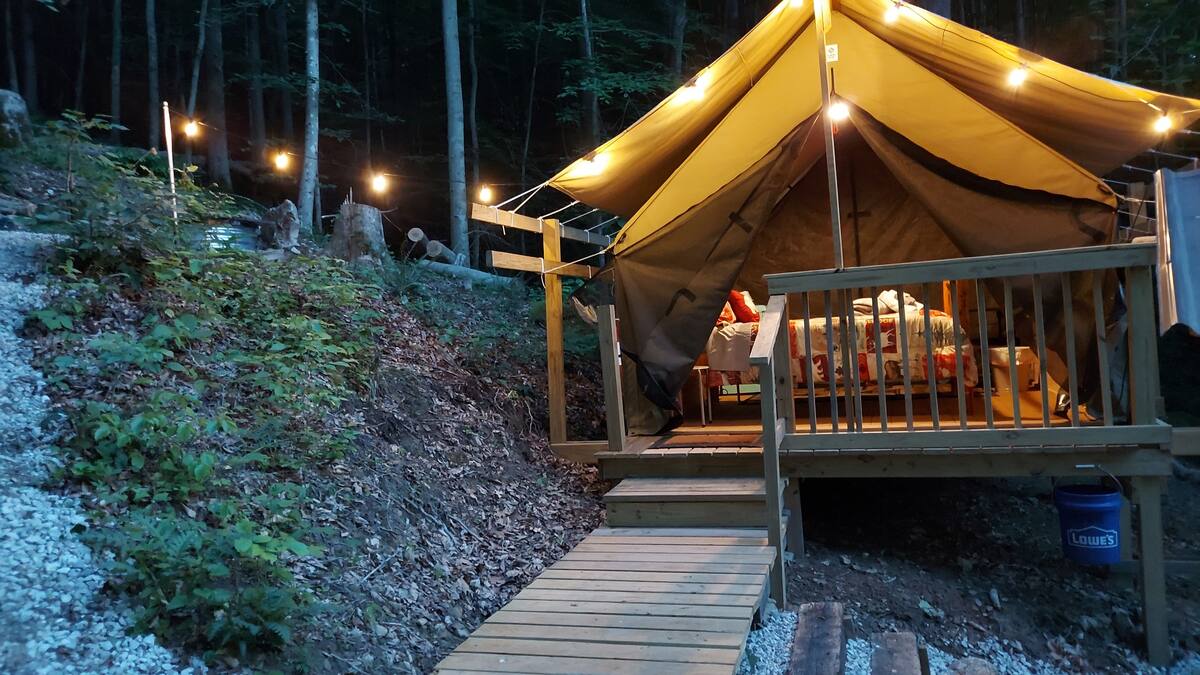 Ever dreamt of a camping getaway but didn’t have the gear? Welcome to Cabin & Canvas, your ultimate glamping retreat in the heart of the Red River Gorge. Nestled on five private acres at the base of Love Dove Mountain, our four rustic tents offer a peaceful escape with all the comforts of home—without the hassle of packing it all yourself. The "Moonshined" tent is on a steep hill. AWD/4x4 not required, but a high-clearance vehicle is recommended. Low-clearance cars may have trouble.