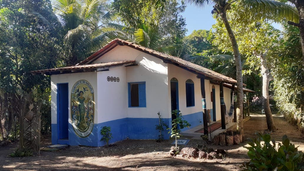 Al llegar al hermoso y acogedor pueblo de Cumuruxatiba "Gran diferencia entre la marea alta y la marea baja" en el idioma Pataxó, pronto te das cuenta de que está en la calle principal y que sigue entre la playa y el acantilado con su exuberante vegetación forestal atlántica y es donde se encuentran la mayoría de los residentes nativos. Y es justo en el tradicional Morro da Fumaça que es nuestra pequeña casa blanca y azul. Construido por el Sr. João de Barro y representado por la artista Anna Göbel.