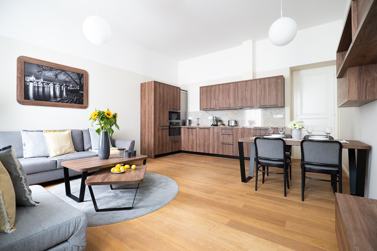 Unbeatable Downtown Location - Live in the Heart of Prague Step out your door and be just 1 minute from the iconic Charles Bridge and a short stroll to Prague Castle, Old Town, Kampa Park, and Petřín Tower. Experience the city like a true insider. Luxurious 5th-Floor Apartment for 3 Guests • 3 spacious rooms • Laundry room • Bathroom + separate guest restroom • Private balcony + shared balcony • Breathtaking views of St. Nicholas Dome and Prague Castle • Modern building with elevator