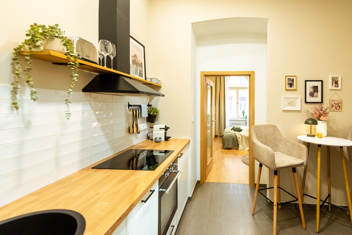 This charming, tastefully renovated three-room apartment (kitchen/diner, sitting room, and bedroom) is in an Art Nouveau building in Vinohrady (Vineyards), one of Prague’s finest and most prestigious neighbourhoods. Unfortunately, the property isn’t suitable for infants or children under 15. If a child is over 15, they’re a fully paid guest, allowing only one extra adult guest.