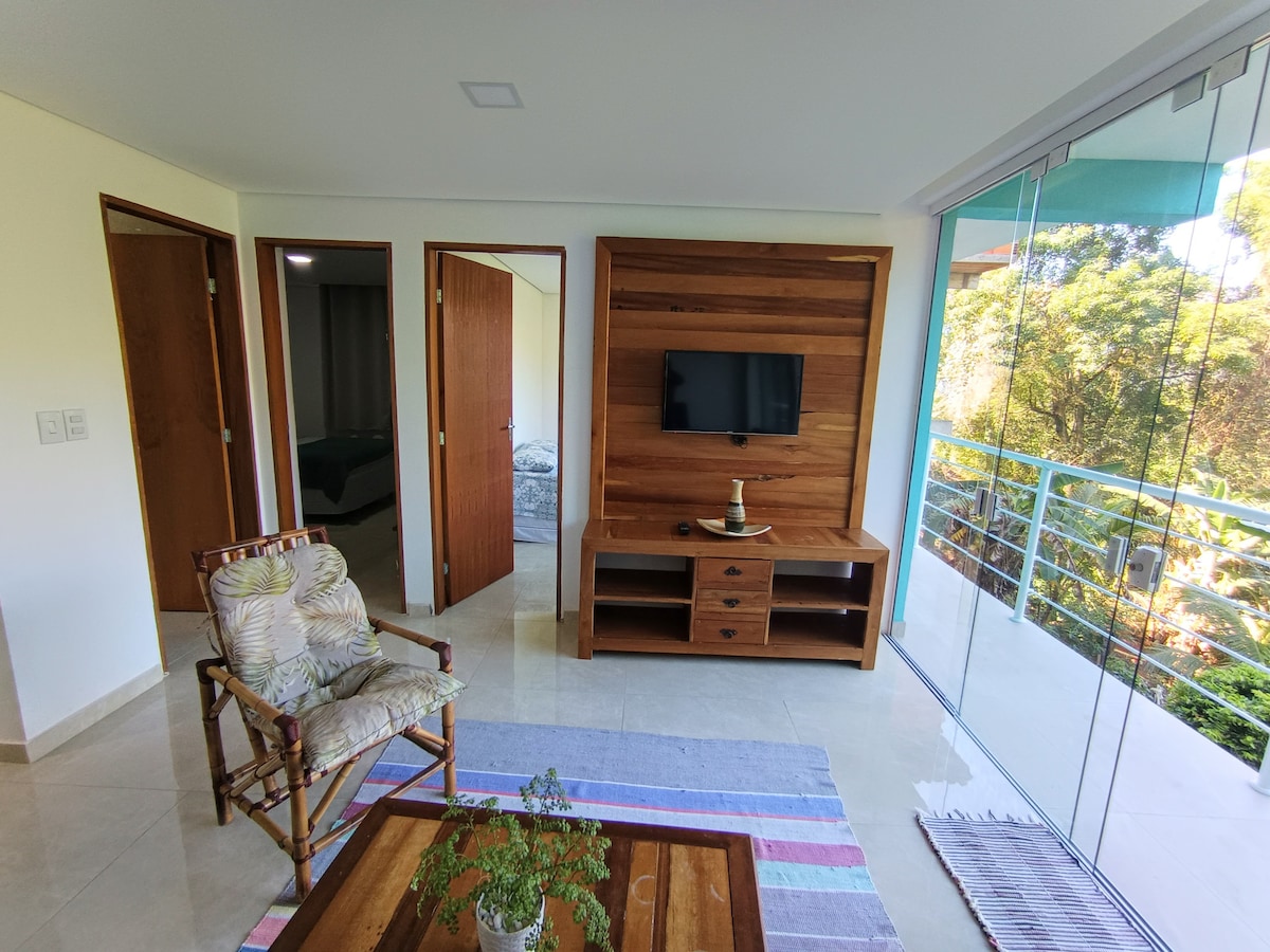 Magnífica vista a 80 metros de la playa de Curral, una de las más bonitas y modernas de Ilhabela. ¡CASA para 4 personas con 2 suites, sala de estar, cocina americana y balcón con increíbles vistas al mar y al atardecer! Internet wifi, TV inteligente de 32pulgadas con NETFLIX, aire acondicionado en las suites, cocina equipada con nevera, estufa, microondas y diversos utensilios. ¡Excelente relación calidad-precio! Nota: Se permite el acceso a la casa con escaleras / Se permiten mascotas pequeñas.