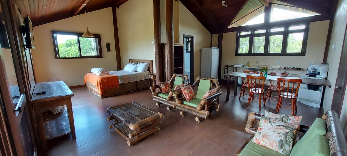 Relájese en este espacio tranquilo y acogedor a 600 metros de la playa en el sur de la isla de Fpólis. Ideal para parejas que buscan el contacto con la naturaleza sin renunciar a la comodidad Situado frente a una exuberante vista del bosque nativo local, rodeado de vida silvestre. Playa con amplia franja de arena, iluminación nocturna, agua cristalina. Cerca de senderos como Lagoinha do Leste 2,5 km, Trilha do Saquinho y cachoeira da Solidão 2 km, Pântano do Sul 2,3 km, con restaurantes típicos junto al mar Visite solardosacores
