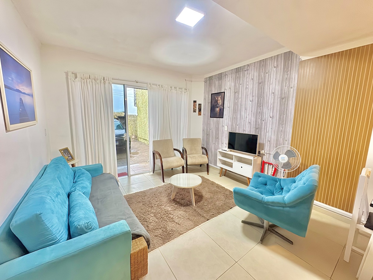 Espacio agradable con patio cerrado, césped, ideal para niños y mascotas, espacio para 3 redes de descanso, gran parrilla para esa parrillada con familiares y amigos, tiene capacidad para 8 personas. Cerca del mar y del comercio, espacio para 2 coches en el patio, casa de esquina, que es sin problemas con el ruido.