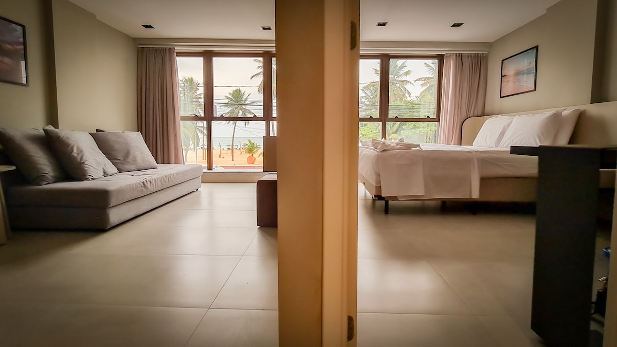 ¡Comodidad moderna con los pies en la arena! Este estudio está ubicado frente a la playa de Bessa en João Pessoa y ofrece todo lo que necesita para una estancia perfecta. Relájese en la cama queen en un ambiente climatizado con Smart TV. La cocina compacta garantiza su autonomía. Como característica distintiva, la vista a la playa está garantizada, y usted todavía tiene acceso a la piscina con vista al mar y al gimnasio del condominio. ¡Reserve ahora para garantizar su experiencia frente al mar!