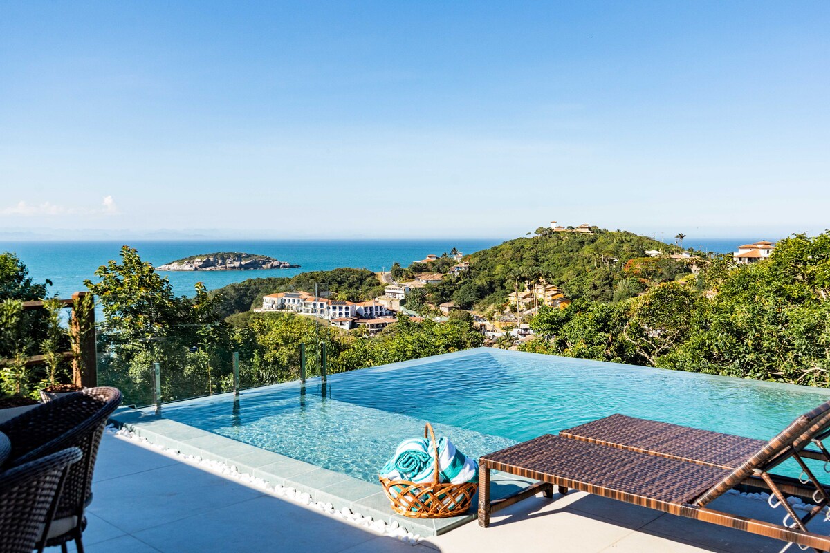 Estadía mágica en Búzios – Villa con vista al mar Villa contemporánea en Búzios con piscina y espectacular vista al mar. Hay 3 habitaciones con aire acondicionado, incluida una suite principal. A pocos pasos de las playas y la famosa Rua das Pedras, ideal para familias o amigos. Ofrece una vista panorámica increíble del mar, perfecta para unas vacaciones relajantes y momentos inolvidables con la familia o los amigos.