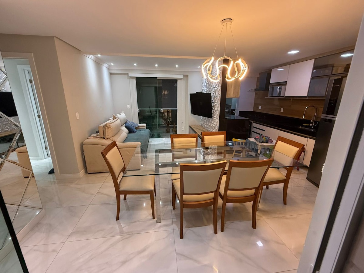 Belo,Novíssimo e Amplo apartamento Avarandado, com 2 quartos :1 Suíte c/TV cama de casal, cama de solteiro e 1 colchão solteiro, 1 Quarto cama Queen ambos com ar condicionado. Banheiros com água quente, secador de cabelo.Sala 2 ambientes, mesa de jantar p/8 pessoas, TV 55"a Cabo, SKY, NETFLIX, INTERNET ALTA VELOCIDADE, sofá Cama de Casal, AMPLA COZINHA completa, Coller. Área de Serviço c/Filtro c/ água gelada e ambiente, Máq. Lavar, FERRO. 2 vagas garagem. Roupa de cama,mesa e banho. Elevador.