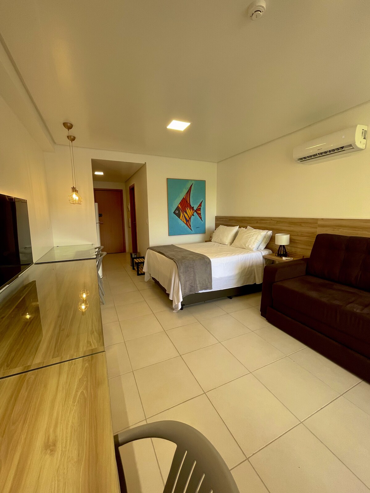El apartamento se encuentra en el Eco Resort Praia dos Carneiros, frente a la playa. Cuenta con dos dormitorios y 65 m² de espacio habitable. Incluye una suite con cama queen y una suite convertible con cama doble estándar y una cama supletoria. La sala de estar cuenta con un sofá cama y un balcón con cortina de cristal. El apartamento se encuentra en el sector Colina, Torre 5, que, al ser el punto más alto del Eco Resort, ofrece las mejores vistas de la playa, el río y los cocotales.