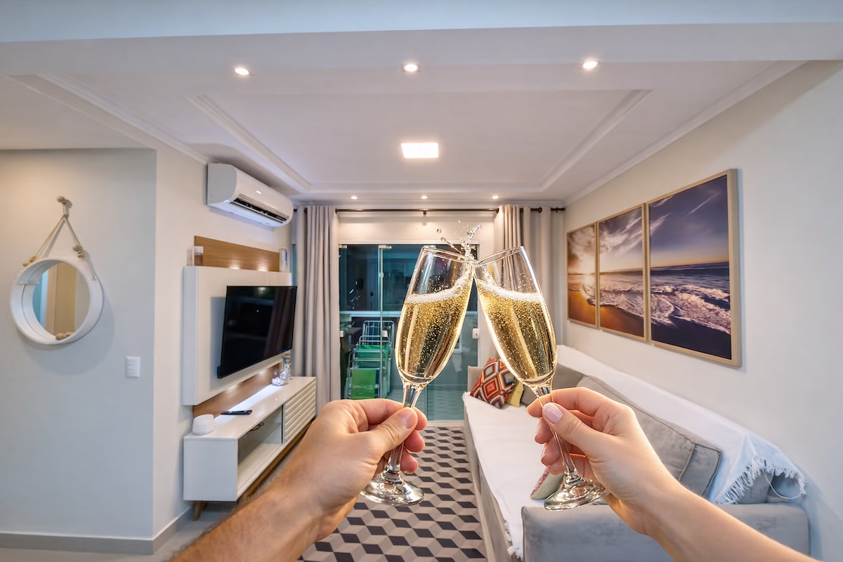 Flat ideal para casais, localizado a apenas 200 metros da Praia de Bombas. Oferece uma experiência completa em um ambiente aconchegante e bem equipado. Desfrute da infraestrutura de condomínio com piscina, área gourmet e varanda, além do conforto do apartamento: cama queen-size, cozinha totalmente equipada, ar-condicionado, sala de estar, televisão no quarto e sala, máquina de lavar roupa, banheiro e sacada com churrasqueira para momentos especiais.