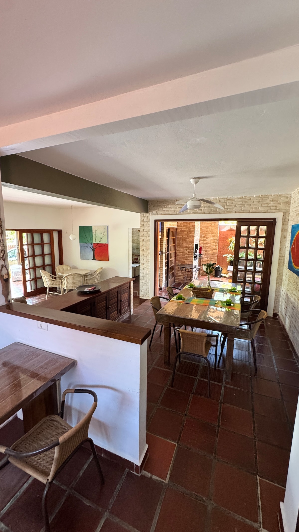 A casa é na Praia da Fortaleza, de frente para o mar, pé na areia, em um terreno muito grande, cercado de muito verde, árvores e muita privacidade em uma linda casa de alto padrão com todo conforto. É uma casa térrea, linda, e a área externa é um verdadeiro paraíso. A casa é perfeita para casais e famílias (com crianças).
