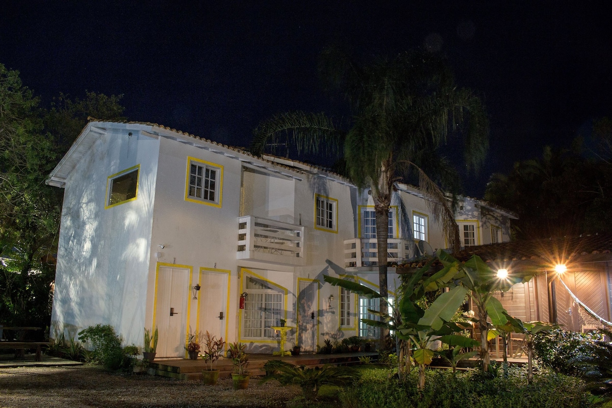 Anexo bohemio y nostálgico, totalmente climatizado y privado, con entrada independiente y escalera caracol icónica. En el segundo piso de la casa principal, para 4 personas: suite con cama queen y hamaca en el solárium, más habitación pequeña con litera (1,50x2m). Frigobar, Nespresso, ropa de cama completa y artículos de playa. Piscina con servicio 5 estrellas de uso exclusivo y prioritario de los huéspedes, jardín de ensueño, desayuno incluido y ubicación privilegiada en la Lagoa da Conceição.