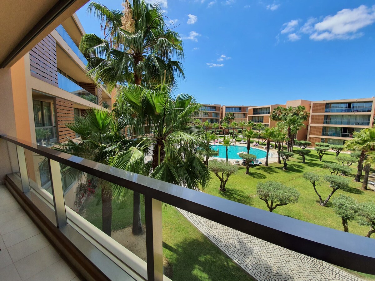 Apartamento de 1 dormitorio en el resort de 5 estrellas Herdade dos Salgados, ideal para parejas con hasta 2 niños que buscan unas vacaciones cómodas y relajadas cerca de la naturaleza, la playa y el golf. El apartamento está en el segundo piso, tiene un amplio balcón (17 m2), un enorme salón (44 m2), excelentes vistas a las 7 piscinas y se encuentra en un resort con amplias zonas verdes (750 palmeras y 2.500 olivos). El resort tiene conexión directa con Salgados Golf y con la playa.
