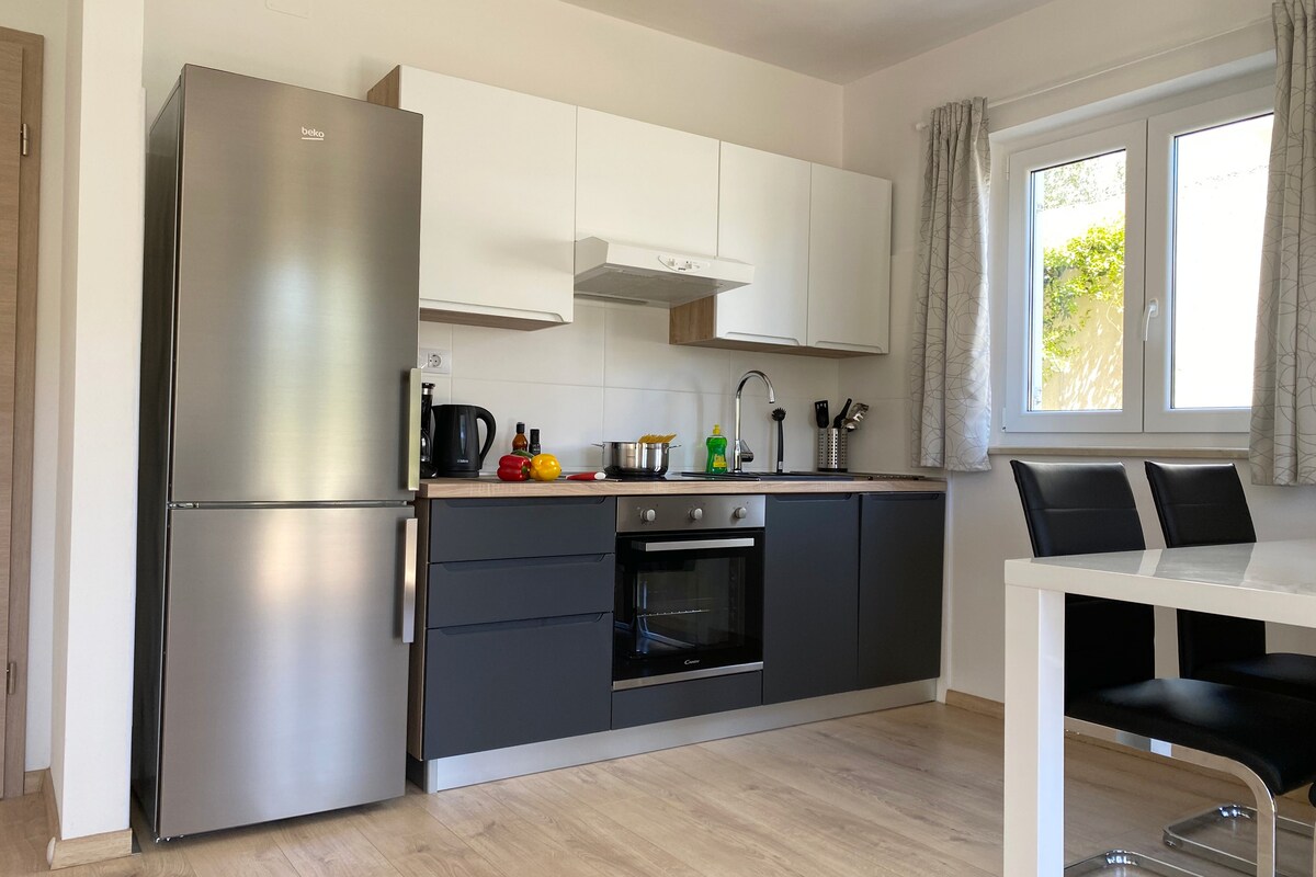Departamento de un dormitorio bien equipado de 40 metros cuadrados a solo un kilómetro del centro de la ciudad y de las playas más bonitas de Rovinj. El departamento tiene un dormitorio, cocina conectada con sala de estar, dos balcones, un baño, TV satelital (canal NETFLIX gratuito) y está ubicado en el primer piso de una casa familiar en un barrio tranquilo y relajante.