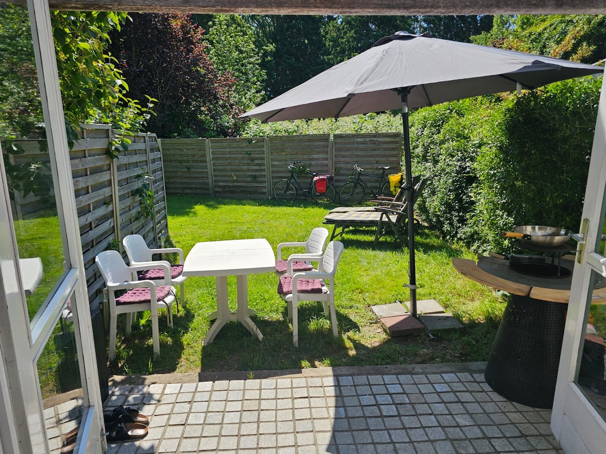 Es uno de los 4 alquileres vacacionales en una casa (lo que esté disponible). El apartamento tiene una habitación, sala de estar con cocina americana, mesa de comedor, sillas, baño y terraza/balcón. El jardín está disponible para que todos los residentes se relajen.