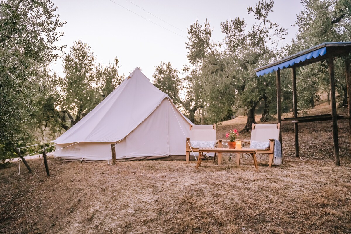 En el pequeño "borgo" de Penna San Giovanni puede alojarse en la cómoda tienda de campaña Sibilla bajo los árboles de nuestro jardín con una vista de las montañas Sibillini. Tienda de campaña de 5m de diámetro (máximo 4 pers.) y alojamiento privado completo con baño, cocina nueva, un dormitorio (otro 2 pers.), salón y entretenimiento para vivir momentos maravillosos. Desayuno con productos locales. ¡Alquiler de bicicletas, senderismo, playas cercanas y mucho más!