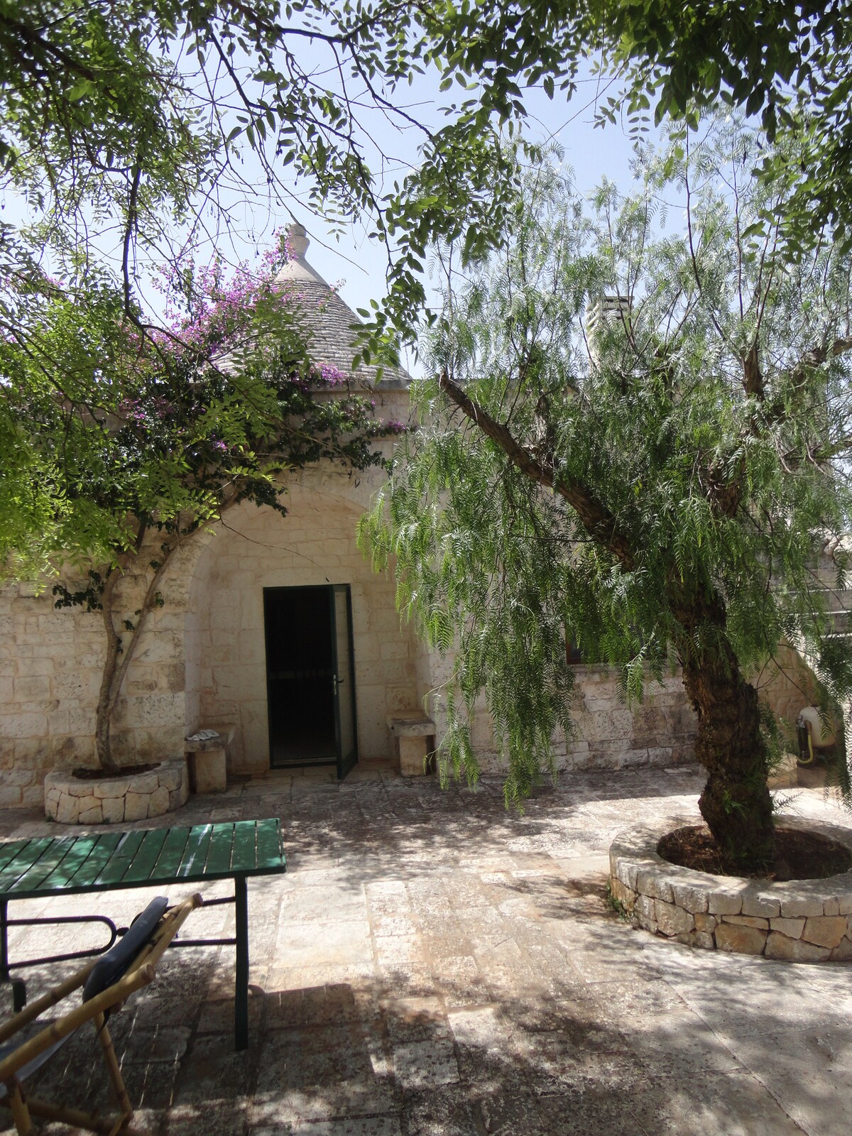 Antiguo trullo sarraceno recién reformado, adecuado para una pareja. En un solo espacio se ha creado una zona con cama de matrimonio, una pequeña cocina equipada con todo y con lavavajillas, un baño con una amplia ducha y una terraza privada con sombrilla, tumbonas y mesa. El trullo no está aislado, sino que se encuentra en una zona con otros 2 trullos alquilados (un pequeño pueblo). Frente al «trullo» hay un bosque de pinos con zona de relax y mucho espacio para poder caminar.
