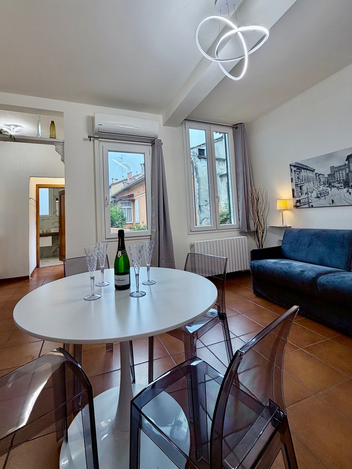 Alójate en un apartamento luminoso, recientemente reformado, elegante y confortable con un aspecto moderno situado dentro de un edificio histórico en el precioso centro histórico. Estás a pocos pasos de Osteria Francescana, el mercado de alimentos Mercato Albinelli, la plaza principal y el Duomo del siglo XII. El casco antiguo es transitable y ofrece buena comida, lugares de interés y tiendas. Desde Módena, también puedes viajar fácilmente en tren a Bolonia, Milán, Roma, Florencia y Venecia. ¡Esperamos que disfrutes de nuestro hogar lejos de casa!