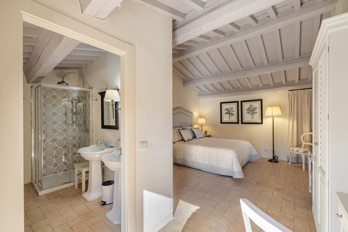 Cómoda habitación doble en una típica granja toscana. Esta es nuestra habitación accesible para sillas de ruedas en la planta baja y cuenta con baño privado con ducha a ras de suelo. Estamos en medio de la naturaleza, pero al mismo tiempo no muy lejos de los centros de población. Por un suplemento de € 8 por persona, ofrecemos un desayuno italiano con productos locales, servido en verano en nuestra terraza. También proponemos unirte a experiencias únicas como degustación de vinos, cena toscana y presentación de aceite de oliva y clases de cocina de pasta.