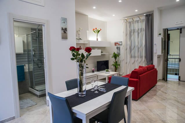 Apartamento entero situado en el centro de Salerno, cerca de la costa de Amalfi, el mar y Pompeya. Está reformado con un estilo mediterráneo y bien amueblado. Se encuentra en el cuarto piso de un edificio de los años 50 y consta de una sala de estar con cocina americana totalmente equipada, 1 habitación grande doble o con cama king size, 1 habitación doble con dos camas y 1 baño con ducha. El apartamento cuenta con wifi rápido, televisión inteligente y aire acondicionado y calefacción con radiadores. Aparcamiento gratuito en la zona del piso.