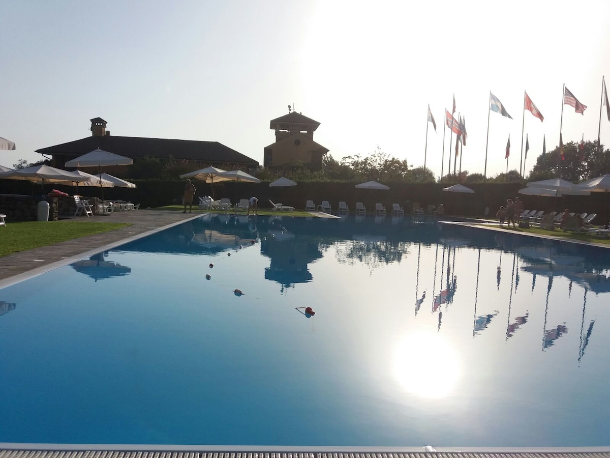 Cálida y acogedora, la villa se encuentra en un club de golf cerrado, cerca de Malpensa, a solo 50 minutos de Milán. Tiene una sala de estar con chimenea y cocina abierta y una terraza climatizada con una mesa de comedor con vistas al hermoso jardín. Una escalera de caracol conduce al primer piso, donde hay un dormitorio con dos camas, una de las cuales se puede sacar, y un dormitorio en el ático con dos camas individuales y un baño con bañera en esquina. En el sótano hay otro dormitorio doble y el segundo baño. Wifi, estacionamiento.