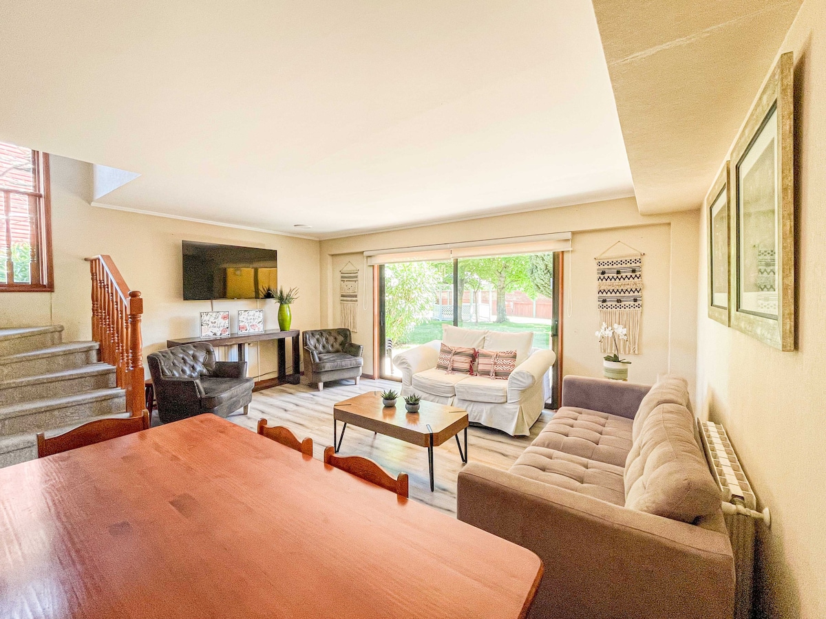 A 10 minutos en auto desde el centro de Pucón, rodeado de árboles nativos, la casa ofrece todo lo que necesitas para relajarte, ideal para grupos familiares grandes. Calefacción central, piscina, tinaja, zona de fogatas, mesa de ping-pong, wifi, una amplia terraza con parrillas. Déjate envolver por la naturaleza mientras disfrutas de la tranquilidad en cada rincón. Aquí, lo único que tendrás que hacer es descansar y disfrutar de una experiencia de bienestar. ¡Te esperamos!